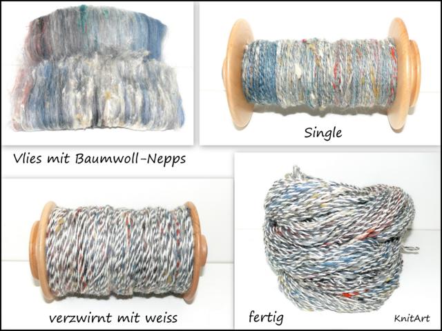Aus weiß-grau und bunten Resten entstehen meist graugrundig-bunte Fasern, welche später hervorragend mit einem 2. unifarbenen Faden oder einem Glitzerfaden etc.