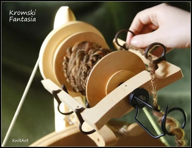 Kromski hat in dieses Rad ein paar Highlights eingebaut: Der Spinnflügel wird durch eine Magnethalterung am Flügeldorn befestigt, so dass man ihn bei voller Spule ganz einfach abziehen, die Spule wechseln und wieder aufstecken kann. Durch die gleitenden Spinnflügelhaken lassen sich die Spulen schön gleichmäßig füllen. Die verschiebbaren Kunststoffteile am Spinnflügel sind keine wirklichen Haken sondern geschlossene Ringe, an denen kein Faden hängenbleibt.
