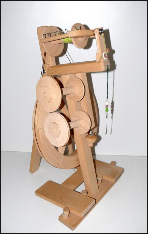 Ein klassisches Spinnrad in moderner Form aus naturbelassenem Buchenholz mit abgerundeten Kanten, alles sauber geschliffen.