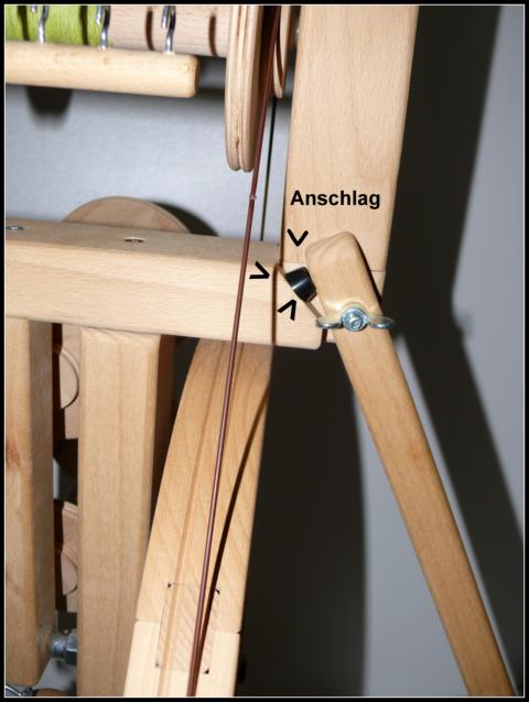 1.) Ein Gummi-Anschlag am oberen hinteren Bein, so dass das Spinnrad in einer gut spinnbaren Position stehen bleibt