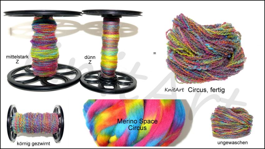 Die Farben bleiben beim Spinnen nicht so grell, sondern die Farben ziehen sich ineinander und so ist die Wolle zwar bunt, aber keinesfalls grell, s. letzte Foto